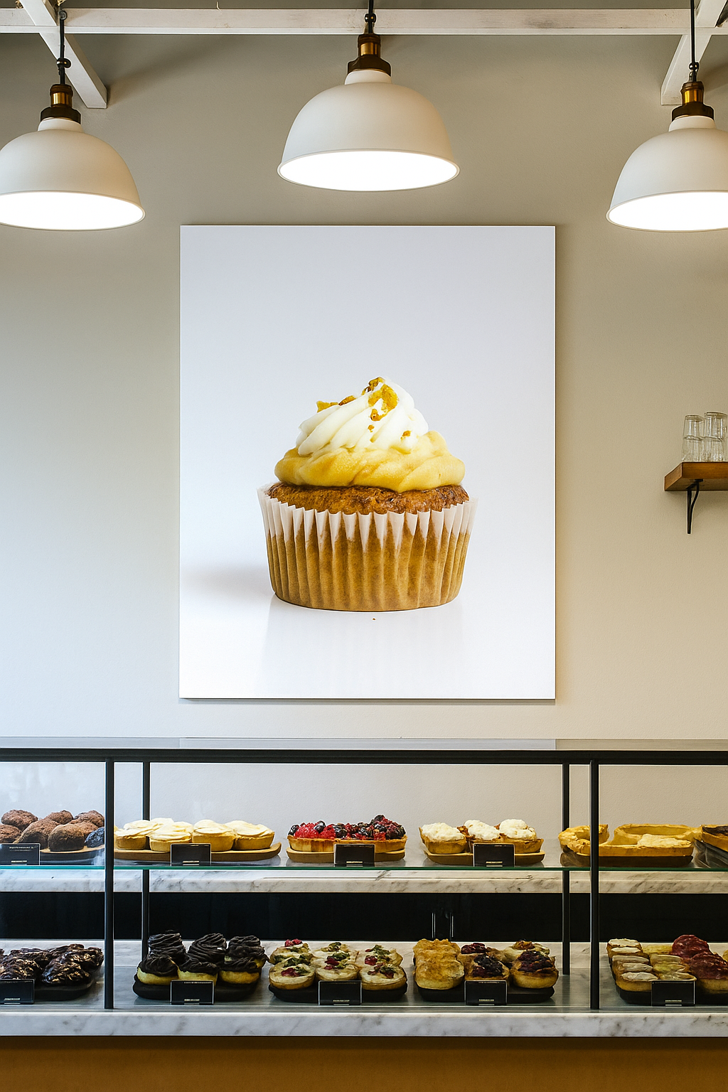 This exquisite wall painting captures a single cupcake, rendered with expert precision to evoke the warmth and charm of a bakery setting. The artwork highlights the delicate texture and inviting colors of the cupcake, making it a perfect focal point that enhances the ambiance and entices customers. Ideal for bakery décor, this piece seamlessly blends art and appetite, elevating the atmosphere with a tasteful, appetizing touch.